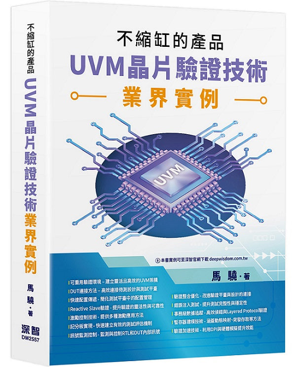 本書介紹UVM驗證環境的架構與應用,第1章說明可重用環境的設計概念,第2至4章探討DUT與測試平臺的連接方式,第5章介紹配置物件的快速配置與傳遞,第6章說明Reactive Slave驗證方法,第7至8章講解激勵控制機制,第9至10章探討記分板的快速實作,第11至12章介紹RTL與DUT內部訊號的監測與控制,第13章說明設計參數傳遞方法,第14章探討驗證平臺與設計整合,第15至16章解析事務級數據追蹤與Layered Protocol驗證,第17章介紹VIP的存取者模式,第18章講解UVM目標phase的額外等待機制,第19章探討模擬結束機制,第20章說明記分板與斷言檢查的結合,第21至22章介紹錯誤注入與ECC測試,第23章探討列舉型態變數應用,第24至25章說明UVM的SVA封裝與控制,第26至28章介紹晶片重置測試,第29至30章講解參數化類別壓縮與中斷處理,第31至32章探討提升覆蓋率與可重用方法,第33至36章介紹隨機約束技術,第37至40章解析暫存器建模,第41至44章說明UVM儲存建模與覆蓋率統計,第45至47章探討C語言存取、建模可讀性與後門存取,第48章介紹程式倉庫管理,第49至50章說明DPI與硬體模擬加速技術。