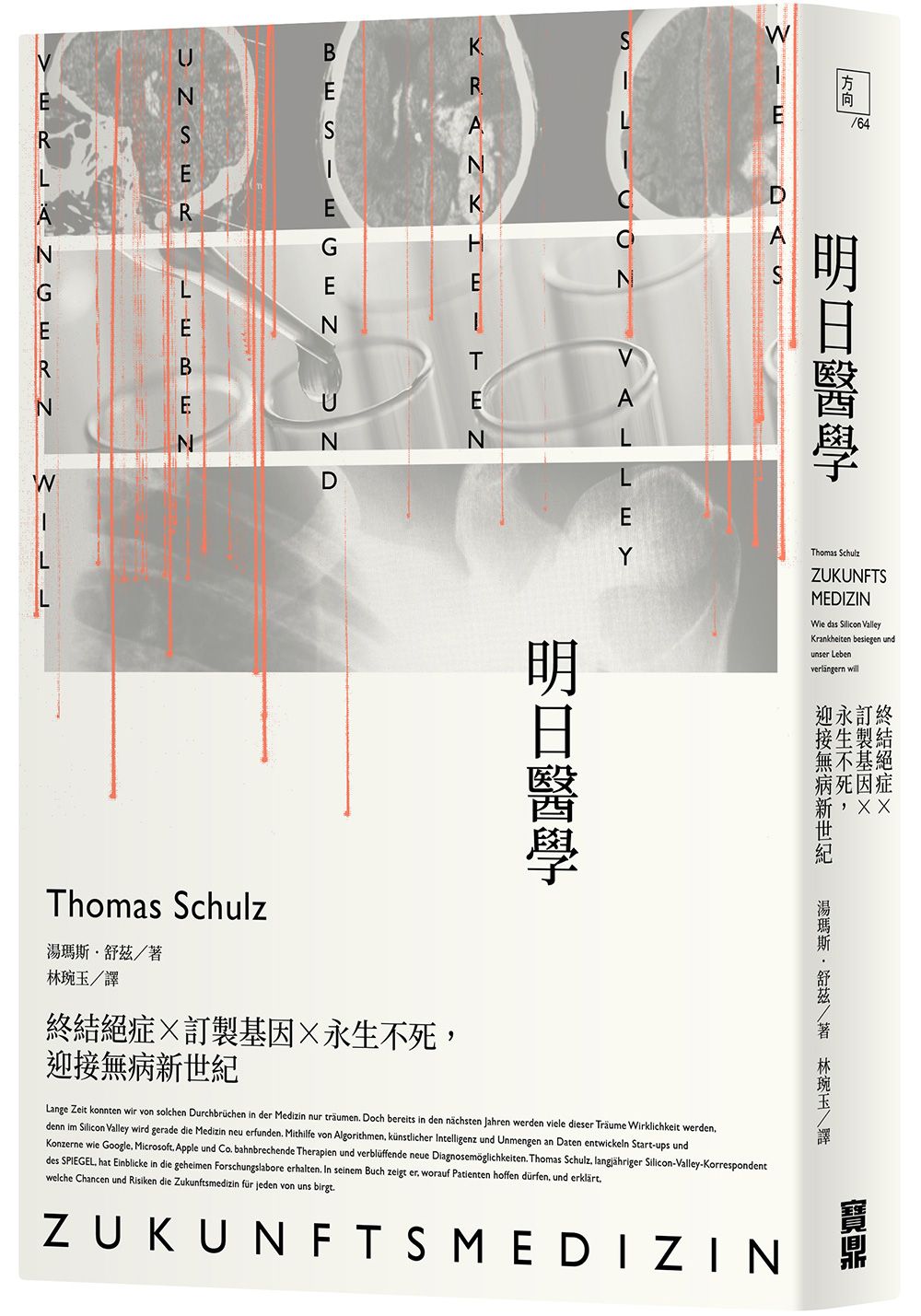 在矽谷,這個向來被視為孕育超凡理念、改變世界發展的完美溫床,一場撼動人類生命的重大變革已鋪天蓋地襲來:這回是醫學發展上的一波新高峰。科技巨擘如Google、微軟、Facebook和IBM,以及無以計數的新創公司,藉由演算法、人工智慧與大數據分析等快速發展的新技術,正爭相致力於為個人量身打造完美的診療方法,除了要在這個全球商機上兆的領域奪得一席之地,更要引領眾人前往一個更健康且更長壽的無病時代。